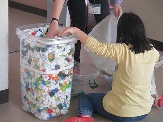 集まったエコキャップを袋に入れています。