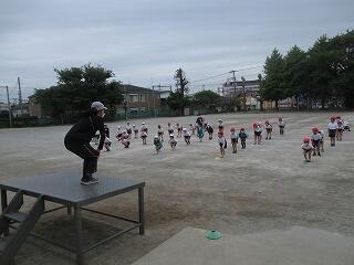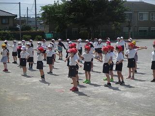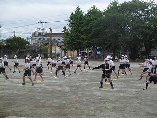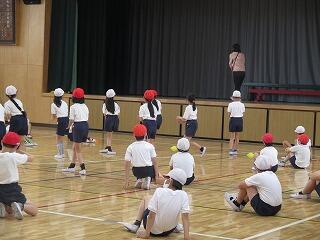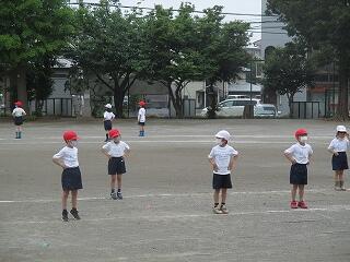 掛け声をかけないで練習するのは,難しいです。でも,1年生も頑張っていました。準備体操をしています。掛け声なしで,先生の合図に合わせています。