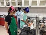 家庭科の学習で「自分でつくったエプロン」を着て、調理実習を行いました。