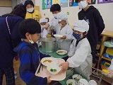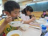 1年生の給食の様子を紹介します。今日のメニューは、ジャージャー麺と安倍川いも、豆腐の四川スープでした。