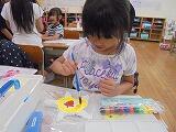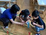 紙工作を一緒にしました。作ったおもちゃを使って体育館で遊びました。