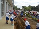 校庭のロープ張りの様子です。丁寧に杭を抜いて再利用しました。