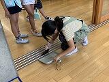 5年生では「ふりこの動き」の学習をしています。今回は理科支援員さんの力を借りて大きな振り子を作りました。2階から多目的ホールに大きな振り子を垂らして実験しました。