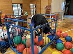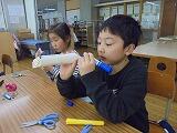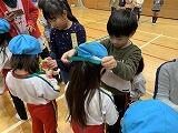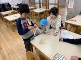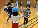 紙工作を一緒にしました。作ったおもちゃを使って体育館で遊びました。