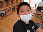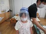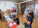 給食は白衣ではなく各自でエプロンを準備しています。配膳の際には、フェイスガードをつけて配膳をしています。