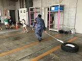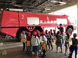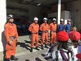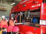 火事が起きると、ホースを引っ張って放水します。そのための訓練を体験させてもらいました。本物のホースは50mもあるそうです。子どもたちは、あの重いものを50mも引っ張ると聞いてびっくり!
