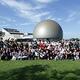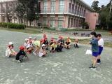 理科支援員さんの作ってくれた教材で、実際の地球と月、太陽の大きさと距離を校庭で再現し、そのスケールを体感できるような学習ができました。体育倉庫の前にある大玉が太陽で、地球はビー玉サイズです。大玉はスクールサポートの先生が膨らませてくれています。