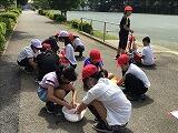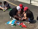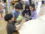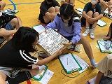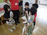 汚れが繊維につくと水の吸収が悪くなったり、生地が傷んだりすることを学び、早速運動会で使った万国旗と4年生が着た法被をもみ洗いや押し洗いで洗濯しました。