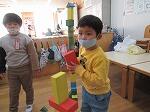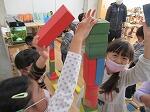 1年生の算数「かたちあそび」の様子です。どこまで高く積めるかな。