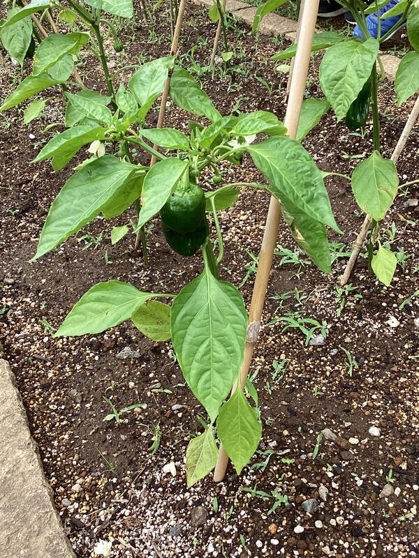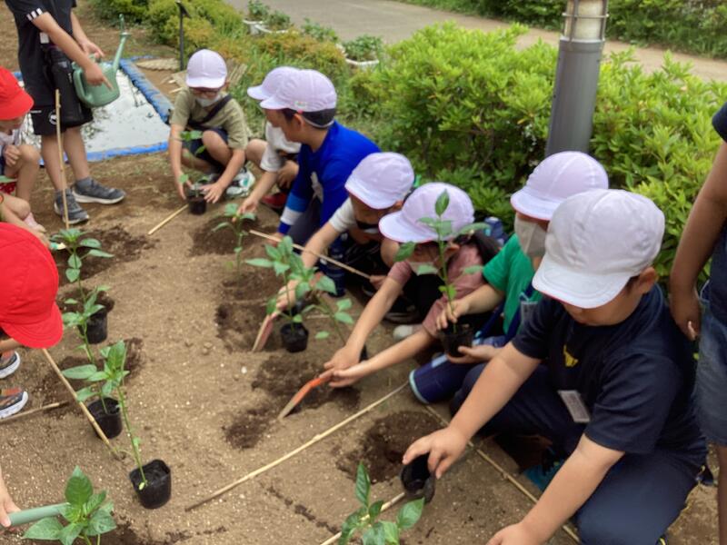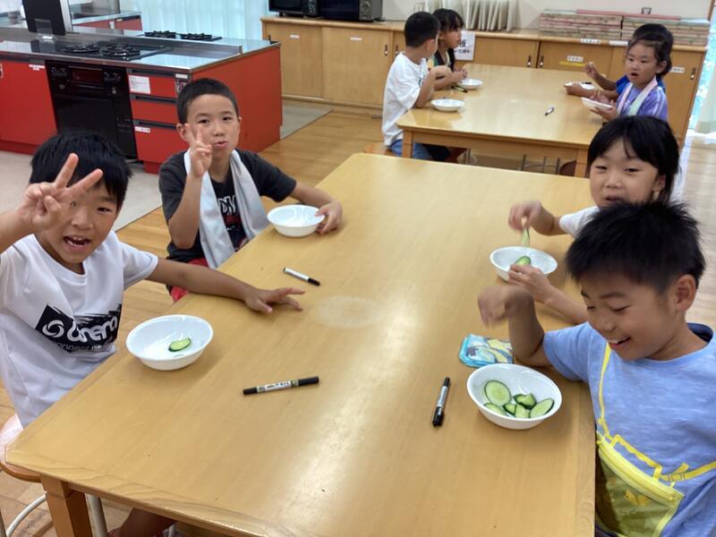 5月に植えた野菜たちがたわわに実り、なすとピーマンは給食のメニューに加えていただき、きゅうりは家庭科室で試食をしました。