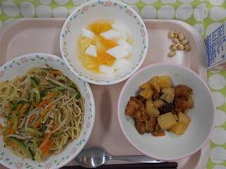 牛乳 冷やし中華 鶏肉とカシューナッツの揚げ煮 杏仁豆腐 いり大豆
