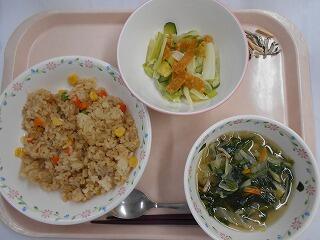 牛乳 ツナピラフ ワンタンのカリカリサラダ 千切り野菜のスープ アーモンド小魚