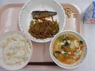 牛乳 ごはん 鰯の梅煮 カレー金平 若竹汁 いり大豆