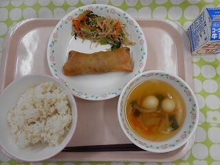 牛乳 ごはん 手作り春巻き ごま和え うずら卵のスープ