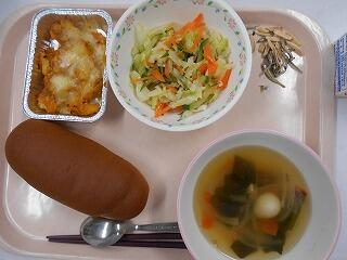 牛乳 黒糖パン じゃが芋のミートグラタン フレンチサラダ わかめスープ