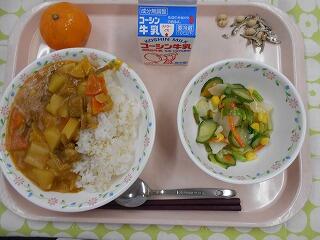 牛乳 地場産カレーライス 柏野菜のサラダ 冷凍みかん 大豆小魚