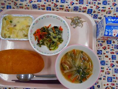 牛乳 コッペパン ポテトグラタン 海藻サラダ 白菜とベーコンスープ 小魚
