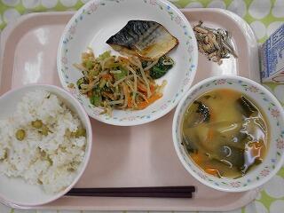 牛乳 枝豆ごはん 鯖の照り焼き ごま和え じゃが芋の味噌汁 アーモンド小魚