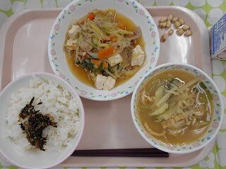 牛乳 ごはん 手作りふりかけ 肉豆腐 えのきの味噌汁 いり大豆
