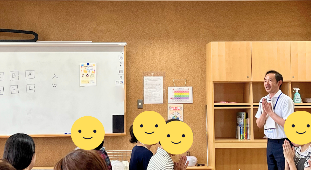 会場は林間学校中だった5年生の教室をお借りして、机を向かい合わせにしたグループごとに着席。