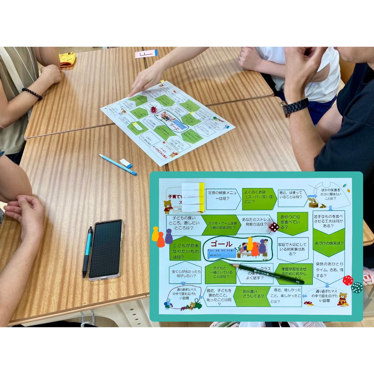 配膳前には、「みんなの子育て広場」支援委員さんによる“すごろくトーク”も各テーブルで盛り上がり、保護者同士の交流も自然と深まります。