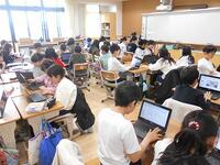 学習の様子はタブレットを使い、ラーニングセンターでは本の帯づくり、図工室では鑑賞教材で振り返り入力の様子