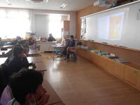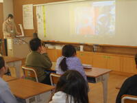 多目的室では6年生の「がん教育」光庭では1年生の「昔遊び、羽根つき」の様子。