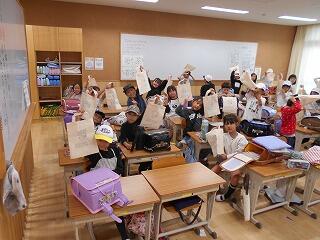 帰りの会でPTA経費によりエコバックのプレゼントを配りました。運動会でがんばってきた子供たちに何かがしたいという気持ちから、特注で製作したそうです。