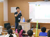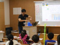 子供たちに、どのペットボトル(容器違い)の容量が多いか、担任が予想をさせます。子供たちはこれまでの経験から「あれやこれや」と予想を立てて楽しそうです。担任が結果を見せるために、実演します。ペットボトル内の液体は「青色」。子供たちが見やすいように、一工夫した教材です。些細なことですが、視覚的にわかることは重要で、優位性があり、「わかる授業」へとつながっていきます。
