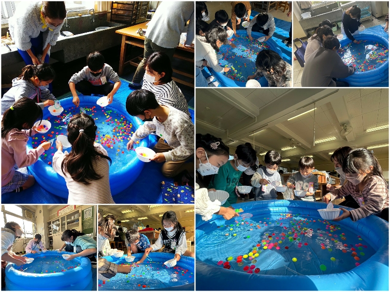 賑やかな夏祭りを彷彿させる イベント、スーパーボールすくい。色とりどりのスーパーボールがたくさん浮かんでいます。お気に入りの色のボールを狙ってすくう…難易度は高め。でも、子どもたちの笑顔がとまりません!
