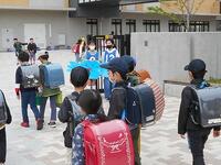 6年生が1年生の登校を見守っています。その様子にも心が和みます。がんばれ6年生。がんばれ1年生!