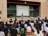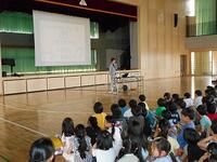 体育館では1年生が防犯教室で交通安全のこと、不審者に出会ったらどうする?などお話を聞きました。