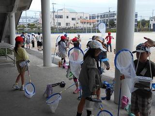 学校では、虫取り、虫探しが人気です。思い思いの虫かごに、ダンゴムシ、トノサマバッタ、カマキリ