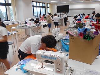 中…ミシンを必死に操作する5年生 保護者ボランティアの募集も常にしています。