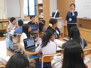 右…校内授業研究会 社会の様子 タブレット活用、考え話し合い、仲間と深め合う授業の工夫