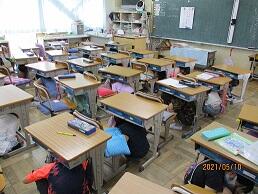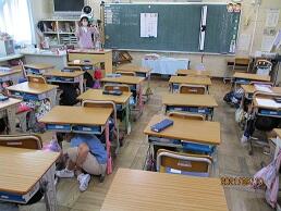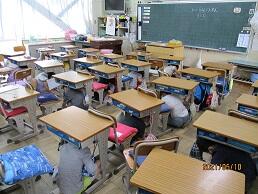 先生の指示に従って素早く机の下に潜り込み,頭と身体を守りました。