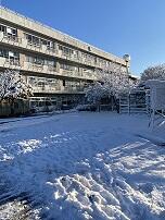 昨日降った雪が校舎校庭に積もっています。一夜明けて今日の始業式の日は快晴。