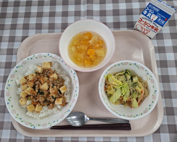 一覧へ 麻婆豆腐ご飯 日時 2026年03月09日(月) 公開対象 給食室カレンダー 詳細 牛乳 麻婆豆腐ご飯 春雨サラダ サイダーフルーツポンチ 作成者 増尾西小学校管理者 更新日時 2026-03-09 11:55:51