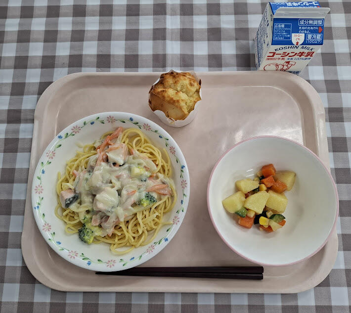 一覧へ サーモンクリームスパゲティ 日時 2026年01月16日(金) 公開対象 給食室カレンダー 詳細 牛乳 サーモンクリームスパゲティ マセドアンサラダ プレーンマフィン 作成者 増尾西小学校管理者 更新日時 2026-01-16 11:37:01