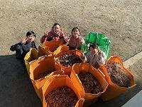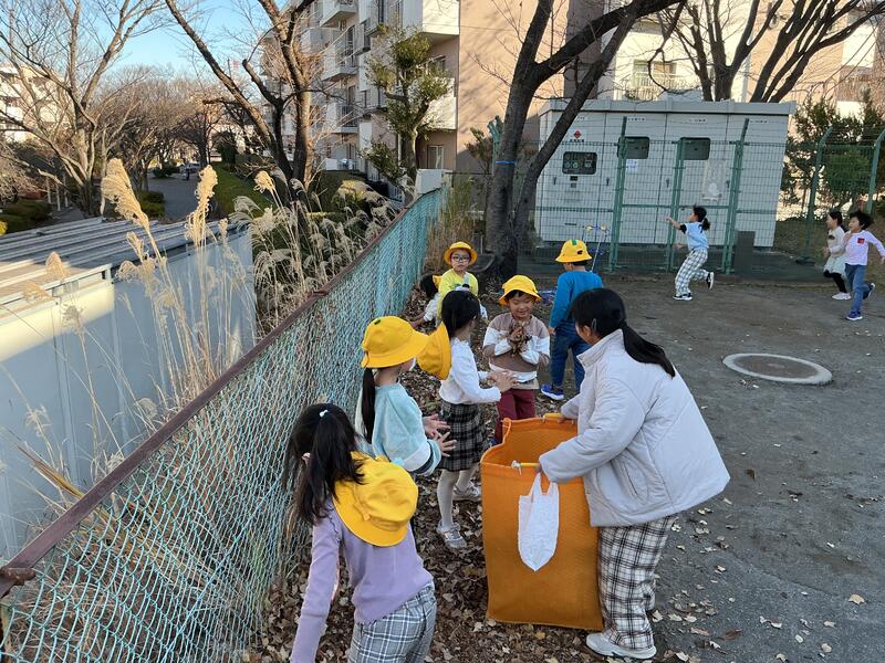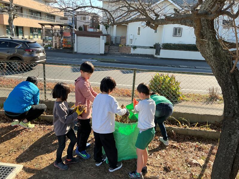 各クラスから集まってきたメンバーが、一生懸命落ち葉拾いをしています。