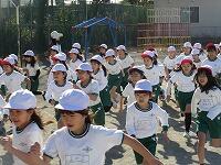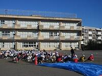 1年生が全体で「準備運動」をしています。走る前は、ドキドキしていました。