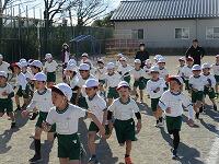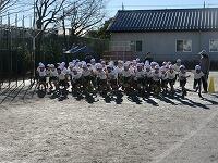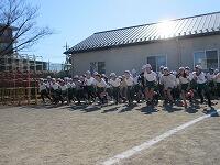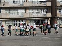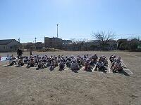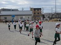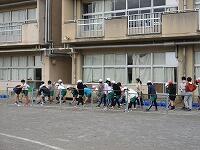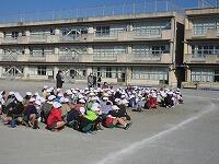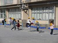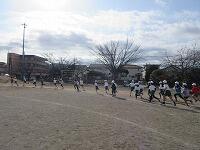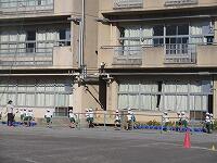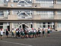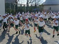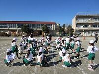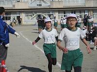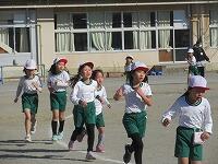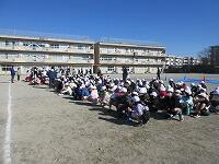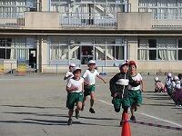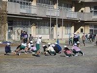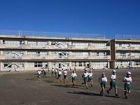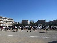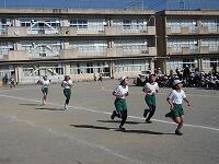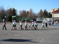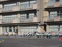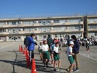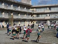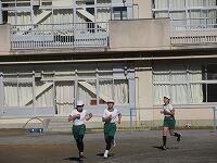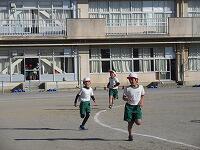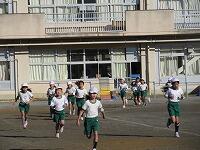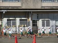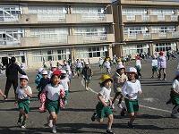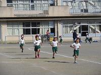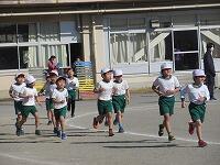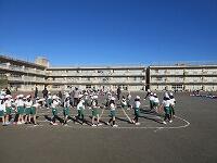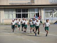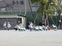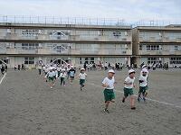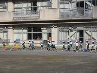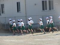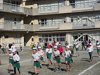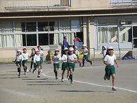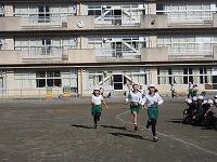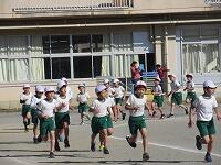 低学年は、学年に分かれて「準備運動」を行いました。走る順番は、(2年女子)→(2年男子)→(1年女子)→(1年男子)です。