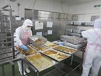 「たらのにんにくみそ焼き」を食缶に分けています。