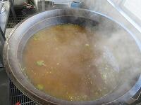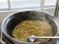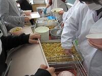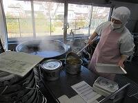 「かぼちゃのけんちん汁」を分けています。「肉じゃが」を食缶に分けています。
