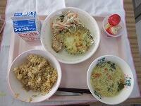 献立は、「キムチ炒飯」と「もやしと春雨のサラダ」、「わかめと卵のスープ」です。そして、「ミニグラタン」と「ユーリンチー」と「さばの照り焼き」の3品から2品をセレクトします。デザートに「フルーツセット」もあります。子どもたちは、待っている時から、うきうきしていてうれしそうでした。