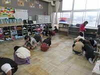 「簡易トイレの組み立て」の様子です。「災害用備蓄倉庫」から、必要なものを運びます。