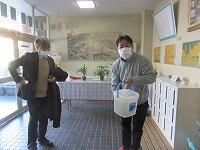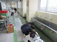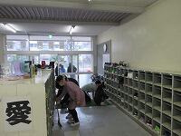 廊下をしっかり拭いています。昇降口では、丁寧に砂などを集めていました。