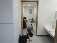 トイレも磨きます。集中して床の汚れを取っています。