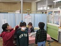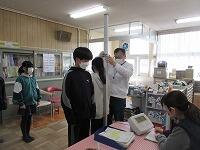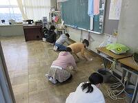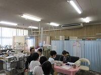 「もしもし、大丈夫ですか?」「・・・。」「反応なし。」「誰か来てください。」「あなた、119番をお願いします。」「あなた、AEDを持ってきてください。」学校では、毎年、職員が「心肺蘇生法の講習」を受けています。また、5・6年生は、「ジュニア救命士講習会」を実施しています。