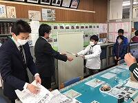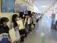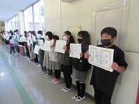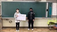 全校を代表して、6年生の給食委員が、調理員さんに感謝の気持ちを「お礼のメッセージ」として届けました。「メッセージ」を受け取った調理員さんは、涙ながらにとても喜んでいました。「大事に飾っておきます。」「献立は、何がおいしかったですか?」と聞かれ、子どもたちは、「和え物です。」、「すまし汁です。」、「ユーリンチーです。」等々・・・答えていました。